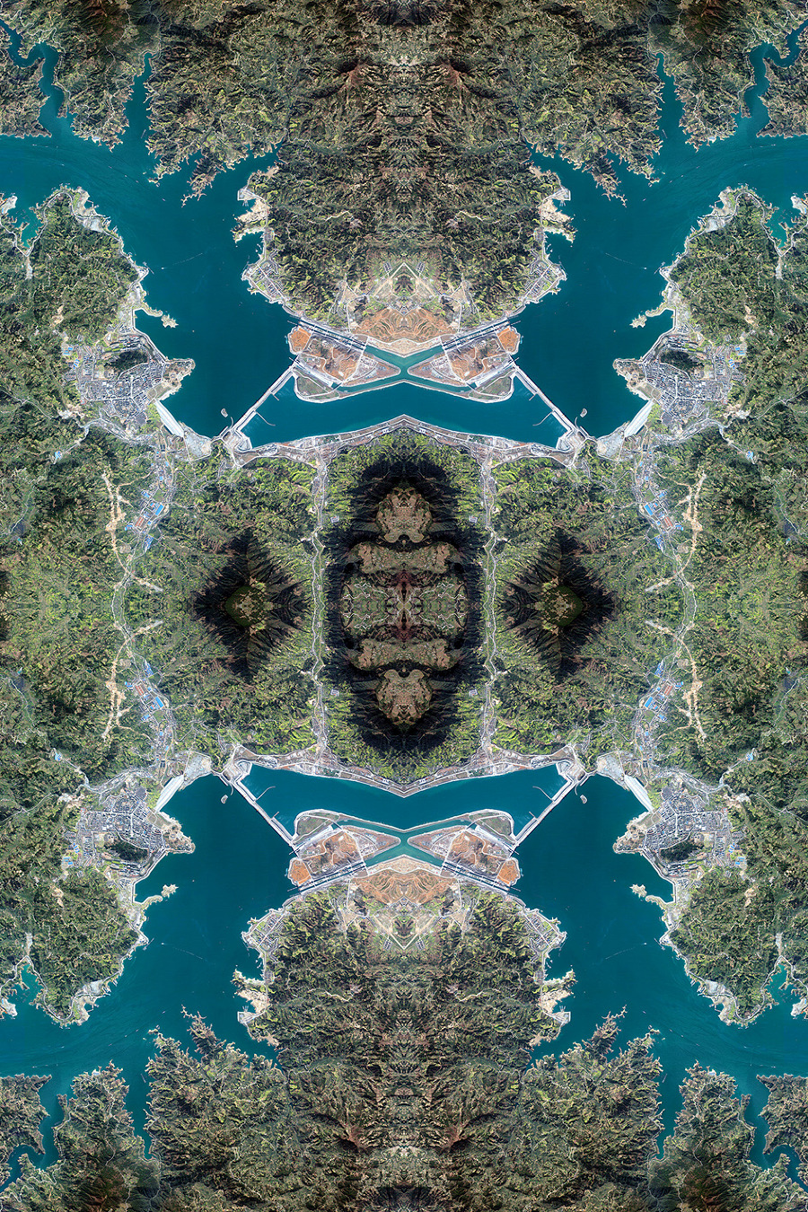 As in the Welcome to the Anthropocene video, the perspective in these works is a god-like one from above, conveying the enormous power of our species. Interestingly, most of David’s works are in portrait, not landscape format. To me this suggests another reference to the powerful and dominant ‘human’, anthropocentric perspective; these are not merely aerial landscapes. We can see this too as David’s creates kaleidoscopic pattern arrangements of the data files, moving the works to an abstract level. We find too that his initial inspiration were influenced by the ancient formal patterns of Persian rug makers. Such ancient textile patterning, David informs us, allowed weavers of the past ‘to record their experiences more literally … of the war torn land that surrounded them.”