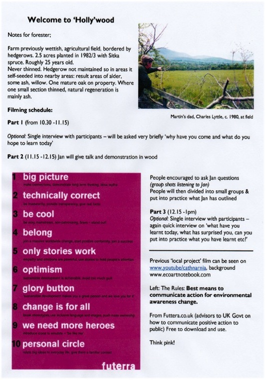 One of my external hard drives failed last week – I’ve have had to order a new drive and won’t know how much I will recover (its the drive where I have been storing a lot of my video footage) but not panicking yet as most of my work is backed up – I hope – maybe I’m still in shock as the drive isn’t that old. Anyway, have been coming across old files and found these information sheets (see below) of when I began the transformation of my conifer plantation back in 2008. A big part of my PhD work is documenting, making explicit, the decisions I have made in my forest-art-ecology-politics project and one leading arts-land educator has pointed out that its important to trace the origins of such projects, as they often begin well before a creative arts PhD is undertaken.