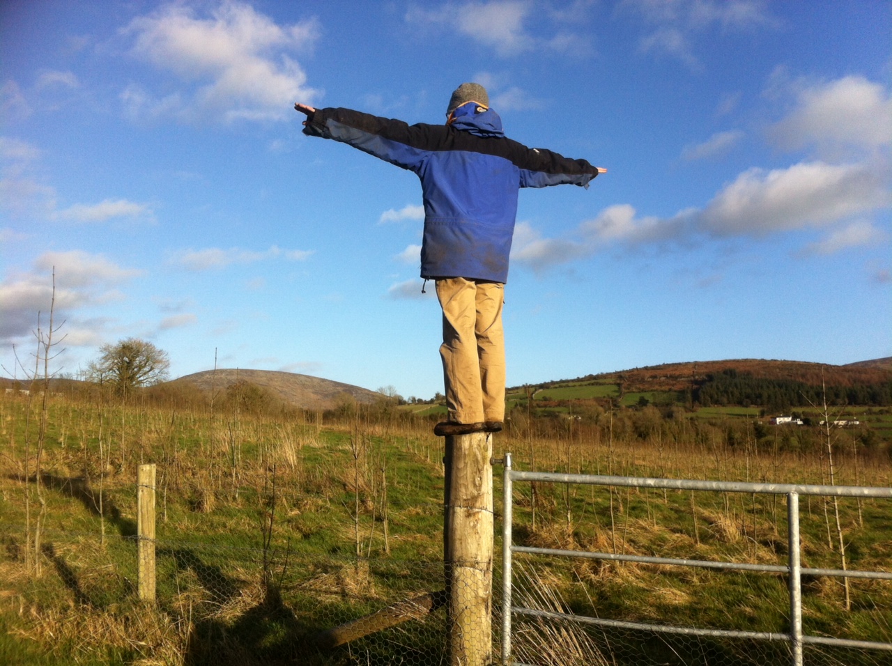 Yet in between all the storms we have had the occasional nice day. One sunny afternoon I went to visit my friend Nicola and her partner Alan. Nicola is an extraordinary successful international felt-maker, teacher and blogger who has also planted around 8 acres of her land with mostly deciduous broadleaf trees. I caught her planting her ‘Australian corner’ that afternoon – eucalyptus trees, as she’s recently found their leaves fantastic for her printed textile work. As it was a lovely afternoon we then went to ‘visit’ her Ash and other broadleaved trees. So it was heartening to see her Ash and other trees doing so well. Not sure what came over Alan but he jumped up on the fence and I snapped this photo above. I couldn’t help but think it was a positive image to think about the many new trees growing in recent years amidst the storms that had rolled across Ireland this winter and caused so much destruction. Like the well-known Angel of the North sculpture, here Alan was the ‘angel of the young Ash trees’.