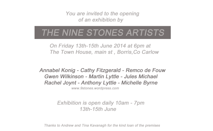 9 Stones Artists Opening 13 June at 6pm – ALL WELCOME! (the night before the Borris Festival of Writing and Ideas begins)