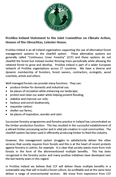 So I was very honoured yesterday to accompany my Pro Silva Ireland committee colleagues: continuous cover forest consultant, and past Chair Paddy Purser, Chair and expert 4th generation timber-harvester Liam Byrne, foresters – Manus Crowley and Padriag O’Tuama, to the Oireachtas (the houses of the Irish Parliament). Paddy gave a statement on behalf of Pro Silva Ireland members to the Irish senators and members of parliament who are part of the Joint Committee on Climate Action – Climate Change and Forestry panel.