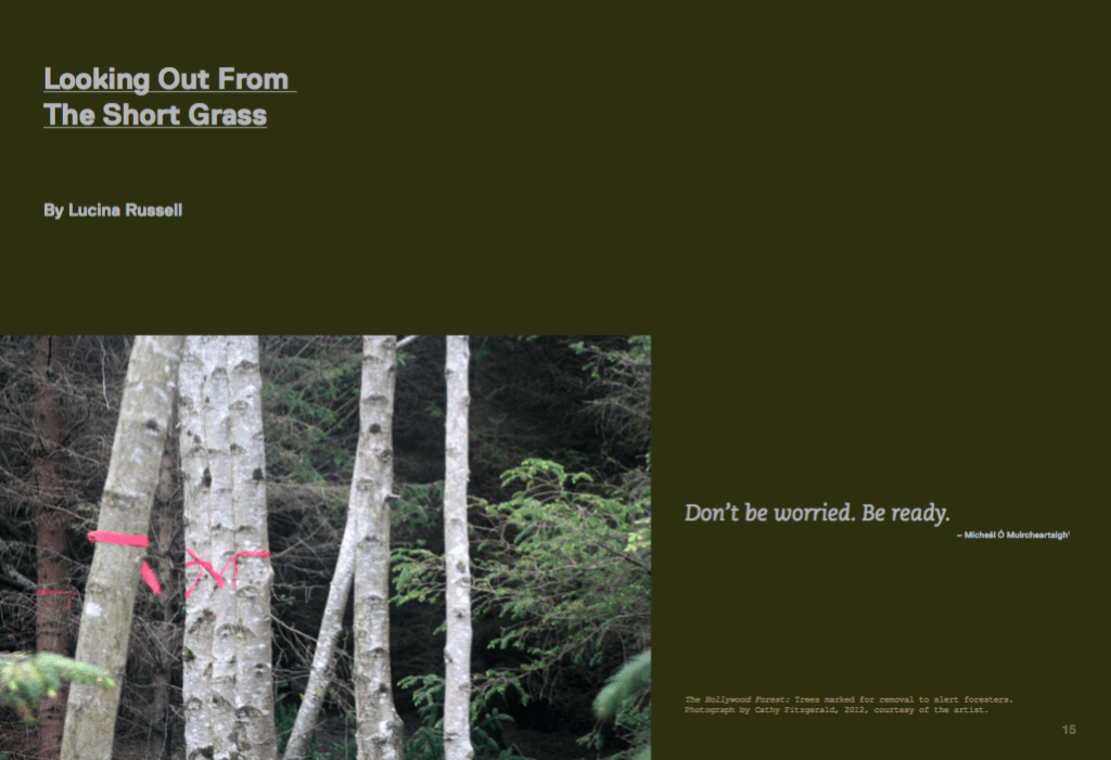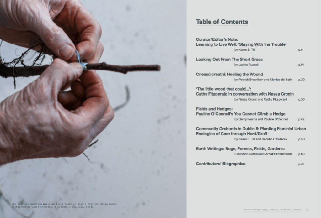 Earth Writings: Bogs, Forests, Fields, Gardens includes artwork and exhibition vignettes, and essays with the artists in conversations with Irish Studies and Geography scholars Patrick Bresnihan, Nessa Cronin, Gerry Kearns and Karen E. Till. With introductions by Lucina Russell and Karen Till.