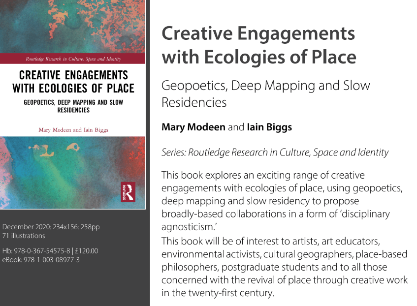 I’m very excited to share an important new Routledge book, Creative Engagements with Ecologies of Place: Geopoetics, Deep Mapping and Slow Residencies (2021)–by artist-educator-researchers–Prof. Mary Modeen and Dr. Iain Biggs, former co-directors of PLACE International.