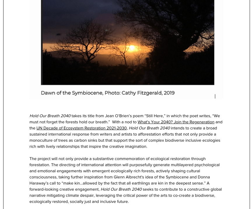 In recent weeks, I had this experience again! I was unexpectedly contacted by ecopoetry educator, Dr. Heidi Staples, of the University of Alabama’s English department. Heidi had somehow connected to my Hollywood Forest Story as she is now residing in Ireland. She wrote and ask for my thoughts about developing a several decades-long online project, to invite the world’s creatives (working in and across all art forms) to commemorate the World As Forest. She had chosen the moving lines to inspire creatives to respond to, from the Irish poet Jean O’Brien’s poem “Still Here,” in which the poet writes, “We must not forget the forests hold our breath.” OH MY!!