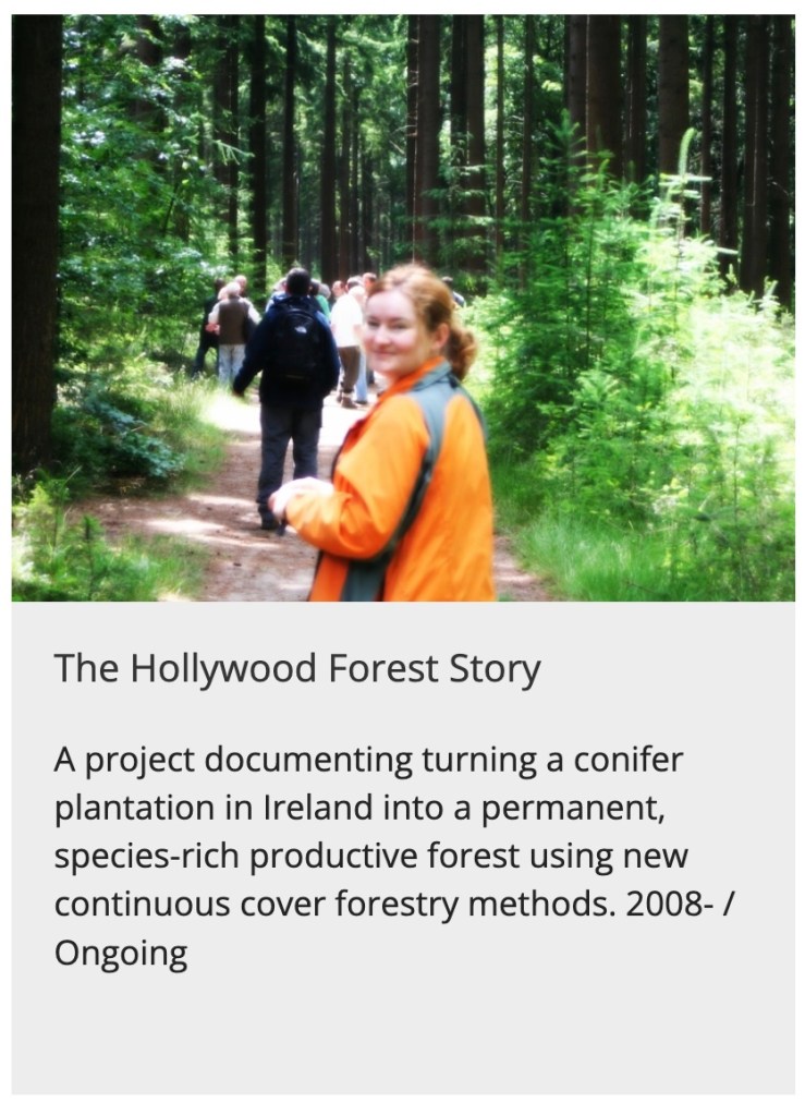 Whilst the cultural shift toward more sustainable forestry in Ireland is ongoing and evolving over recent decades, with many challenges still ahead for the Irish forest sector, I’m pleased to have recognition of the value of ’embedded-in-place’ creative multidisciplinary practices, including my ongoing Hollywood Forest Story (begun in 2008).