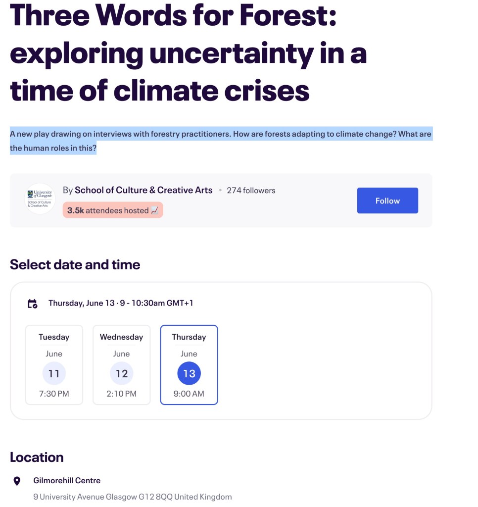More surprises. Some 30 extracts from some of the interviews that Rachel has been undertaking are to be performed live next week in a new verbatim theatre work in Glasgow (there will be three performances) as part of the 2024 Treescapes conference. Apparently, an Australian actor is going to ‘play me’ and read some of my reflections among others. Glory be! I’m sad due to other commitments I can’t attend, but if you are in Glasgow or nearby, and interested in the potential for creative practices to engage people in forest habitats and the need to re-envision more integrated forestry management for these urgent times, here are the booking details on EventBrite – I have copied the information below: