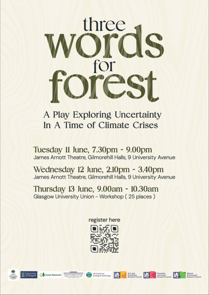 There is also a workshop on Thu 13 June, 9-10.30am, for those who attended either performance. This workshop offers the opportunity to reflect collectively on some of the questions raised by and explored in Three Words for Forest. Places for this workshop are limited to 25. The workshop will be held in the Glasgow University Union.