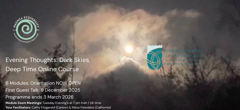 Last year, I was fortunate to receive funding from the Carlow Arts Office to develop a new online course, called Evening Thoughts: Dark Skies, Deep Time. The course is inspired largely by the profound US ecological thinker Thomas Berry’s work and is named after one of his most beautiful books – Evening Thoughts.